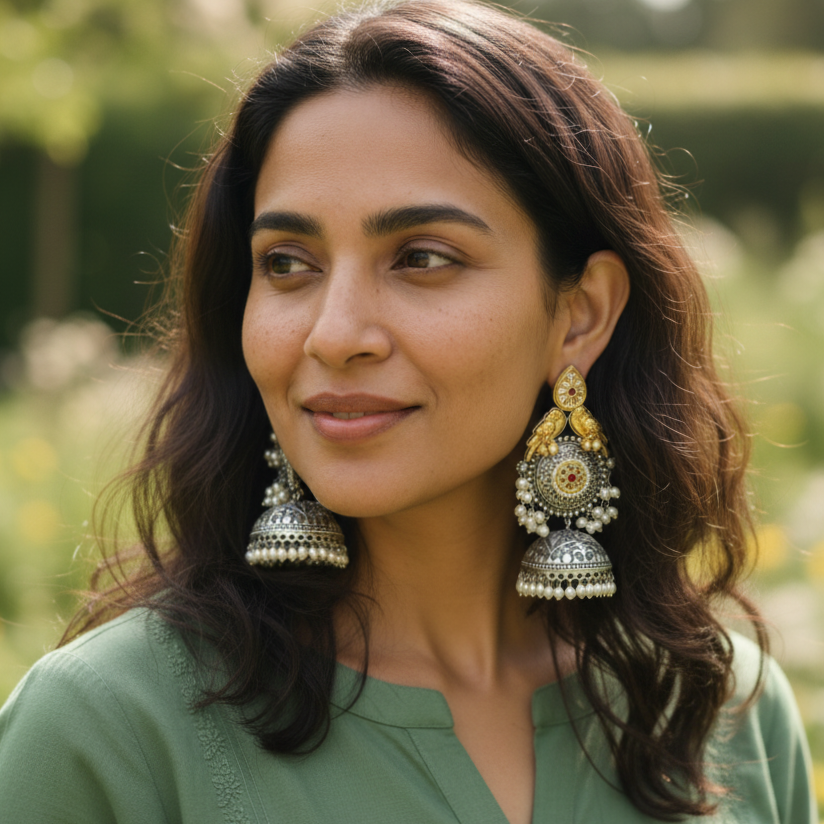 Perfect for festive occasions, weddings, or ethnic celebrations, this oxidised two-tone necklace with matching earrings complements sarees, kurtis, and Indo-western outfits beautifully. Designed for women who love statement jewelry, this set adds a regal touch to any ensemble.